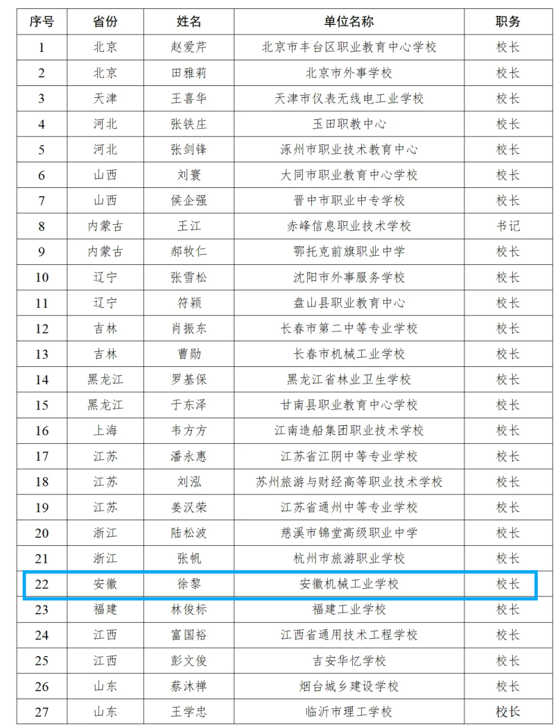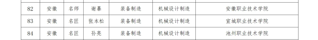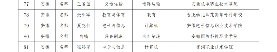 日前,教育部印发通知,公布新时代职业学校名师(名匠)名校长培养计划(2023—2025年)培养对象和培养基地名单,确定高等职业学校名师(名匠)培养对象210人、中等职业学校名校长培养对象50人、培养基地23家。其中,安徽8人入选名师(名匠)培养对象,1人入选名校长培养对象。